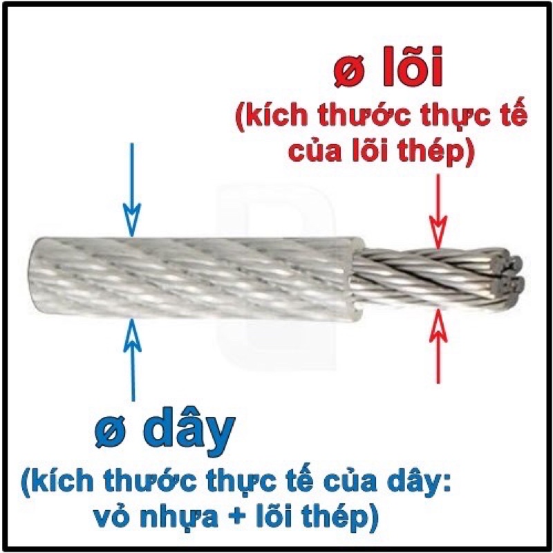 MUA CÁP NÊN MUA KÈM ỐC SIẾT CÁP VÀ TĂNG ĐƠ... SHOP ĐỀU CÓ BÁN NHỮNG MÓN NÀY.Cáp bọc nhựa hay còn gọi là cáp thép bọc nhựa. Lõi bên trong là sợi thép và được bao bọc bằng một lớp nhựa PVC bên ngoài, giúp cho sợi cáp không bị gỉ sét khi để ngoài mưa nắng. Nó có đặc điểm là mềm dẻo, giá thành rẻ hơn cáp thép nếu cùng Ø nhưng lại chịu tải trọng kém hơn cáp thép. KHÔNG NÊN dùng cáp bọc nhựa để cẩu hàng hóa.