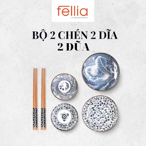 [LIFEMALL993 giảm 10% đơn 99K] Bộ 2 chén (bát) cơm, 2 đĩa,2 đũa Fellia phong cách Nhật Bản sang trọng hoa văn xưa