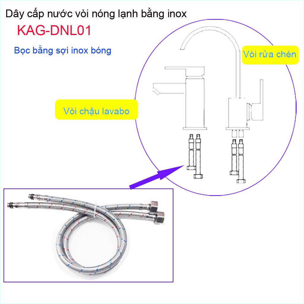 Bộ 2 dây cấp vòi nóng lạnh, dây cấp nước nóng lạnh inox KAG-DNL01Chất liệu: Bộ 2 dây cấp vòi nóng lạnh, dây cấp nước nóng lạnh inox KAG-DNL01 được bao bên ngoài lớp inox, ruột dây chịu nhiệt, dây cấp dùng kết nối dẫn nước giữa ống chờ trong hệ thống nước âm tường và vòi lavabo, vòi chậu rửa chén bát.