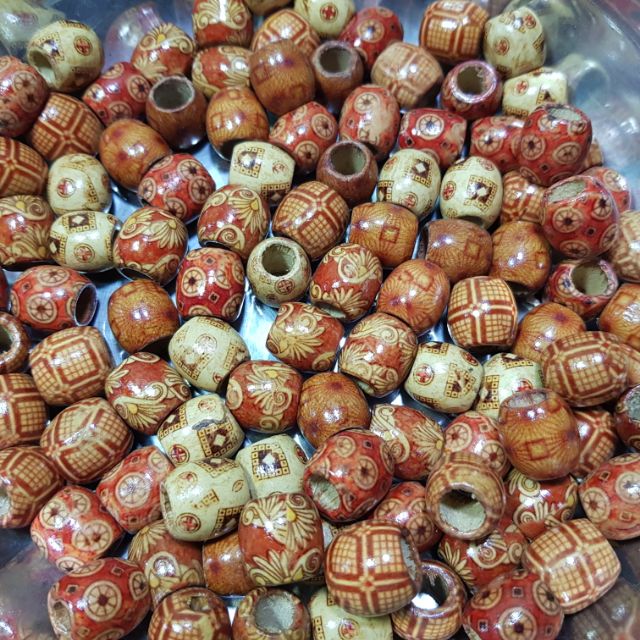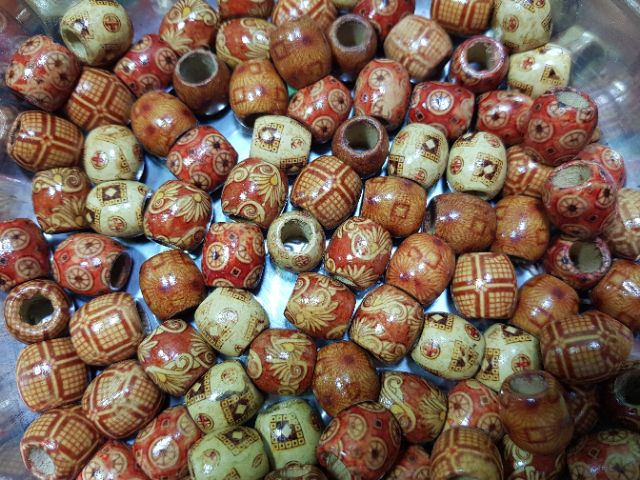 Hạt gỗ có miệng lỗ xỏ gần 1cm. Kích thước hạt 1.5cm.Dùng thắt đầu dây túi hoặc ttang trí ........