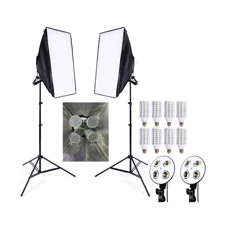 2 Softbox đuôi sứ 4 chuôi 50x70cm - 2 chân đèn 2m - 8 bóng đèn Led 360 độ