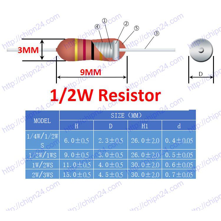 - Công suất tối đa: 1/2W (0.5W)
