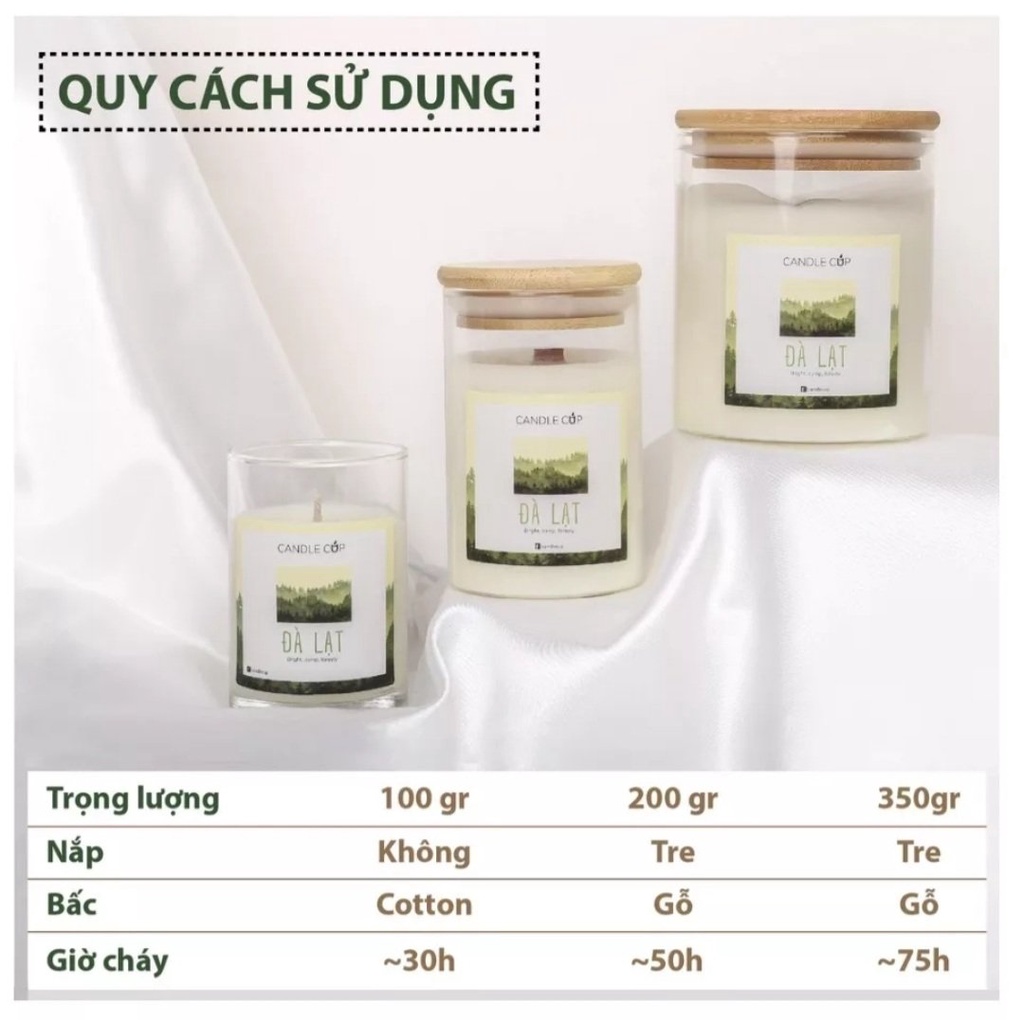 - Trọng lượng : 200g - Bấc gỗ – Nắp gỗ Tre