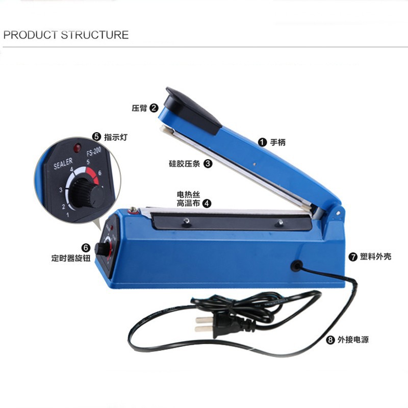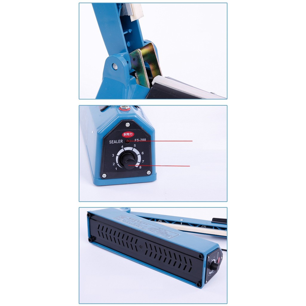 • Máy có kích thước 8 "(200mm) với độ rộng đường hàn 2mm, nút điều chỉnh thời gian hoàn hảo cho độ dày khác nhau của túi