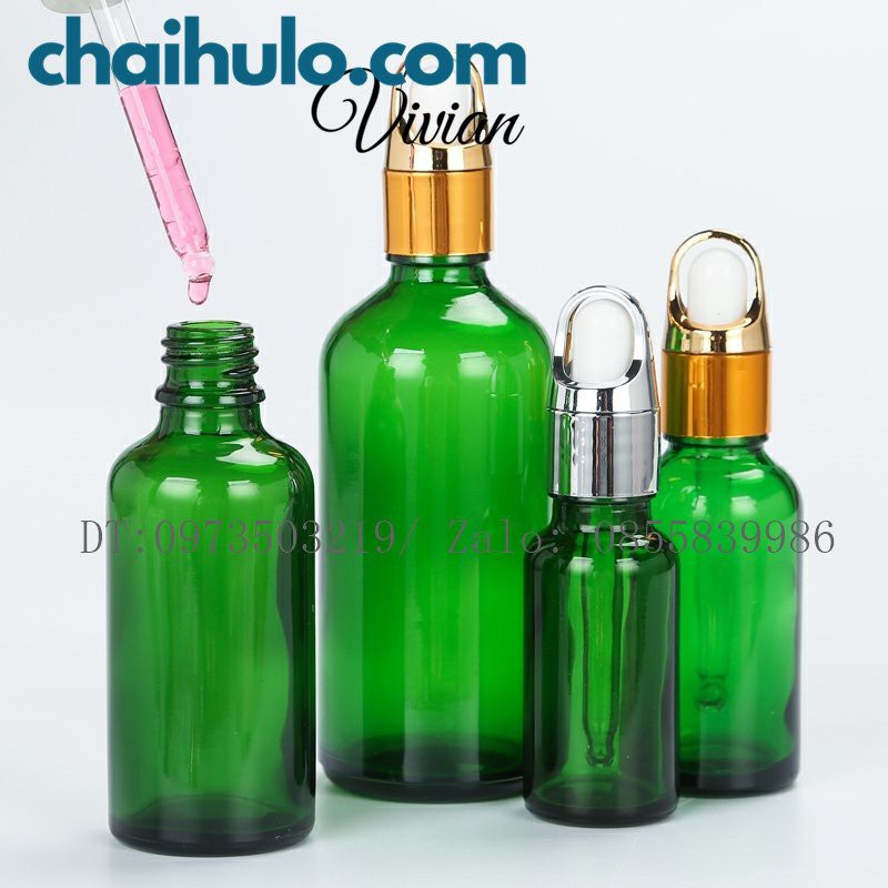 Giới thiệu 20ml - Chai lọ đựng serum, tinh dầu, mỹ phẩm, thân thủy tinh xanh lá, nắp bóp khoét
