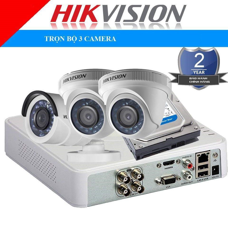 Bộ 3 Camera Hikvision Full HD 1080P - 2MP + Đầu ghi Full HD + Đủ phụ kiện để khách tự lắp