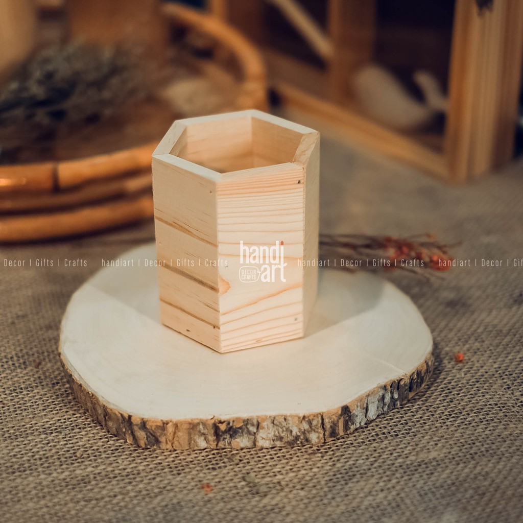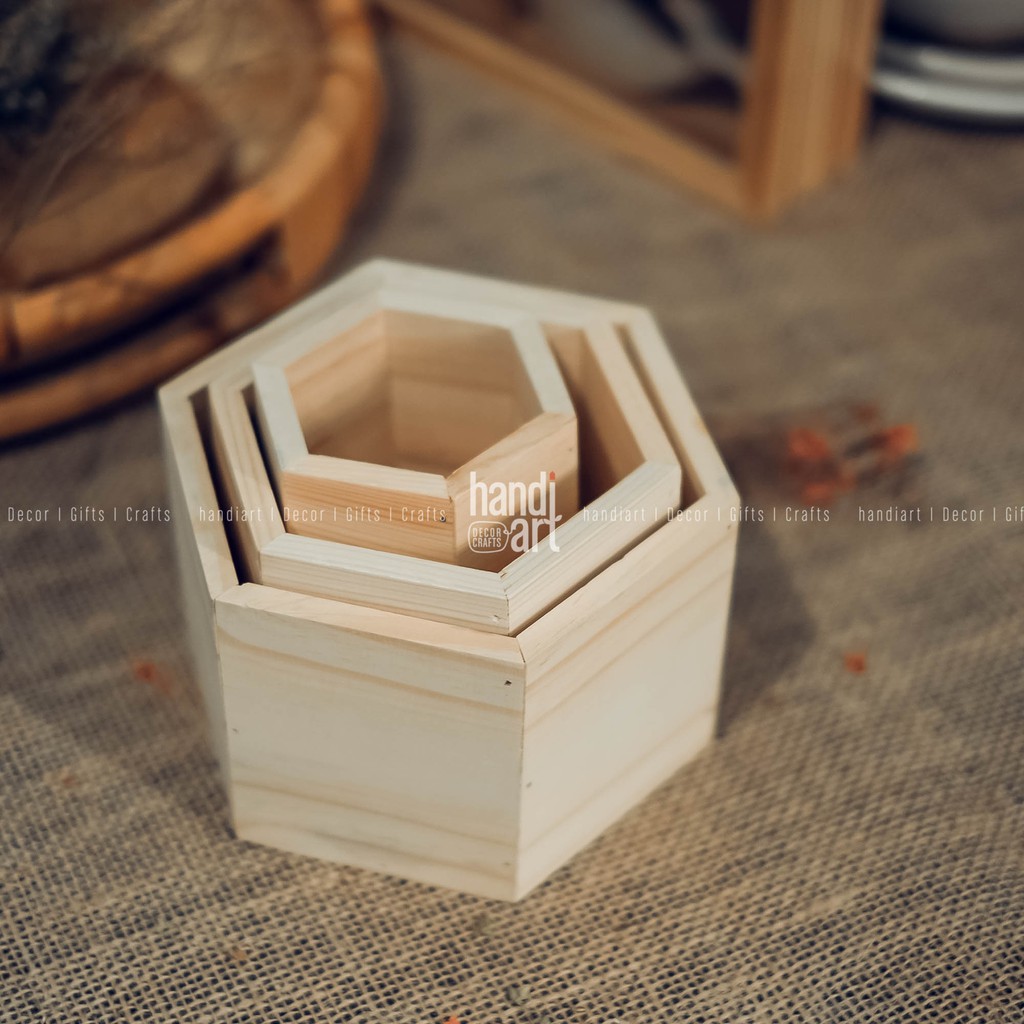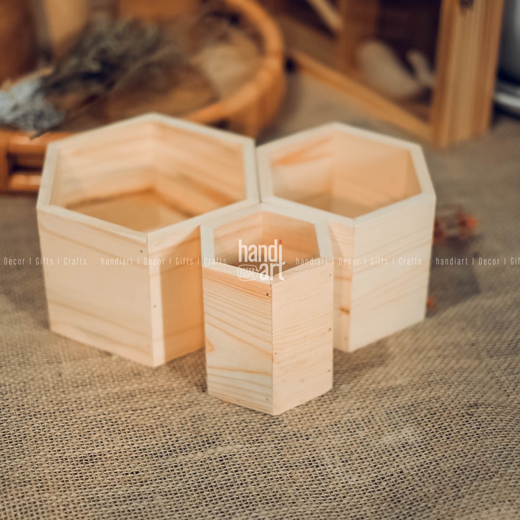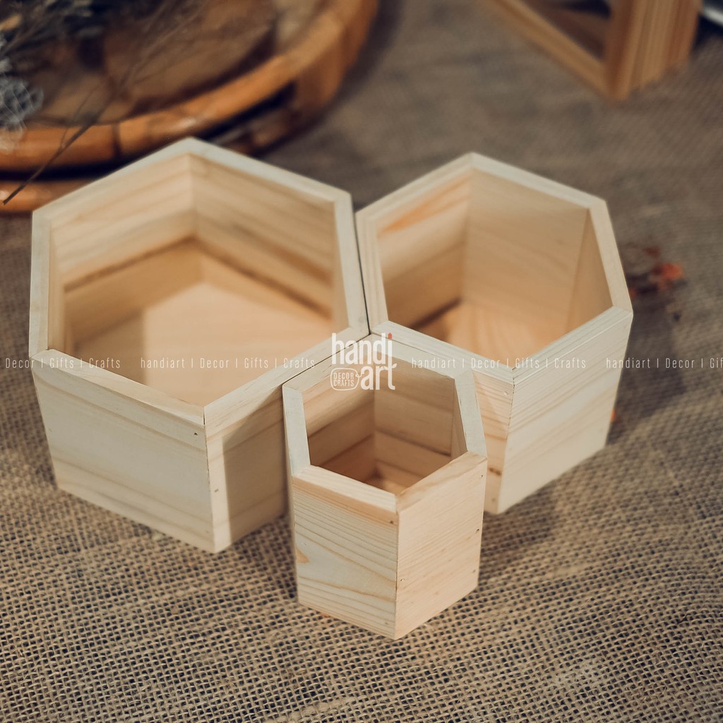 Bộ 3 chậu gỗ lục giác- Được làm từ gỗ thông nhập có vân gỗ tự nhiên mộc mạc xinh xắn