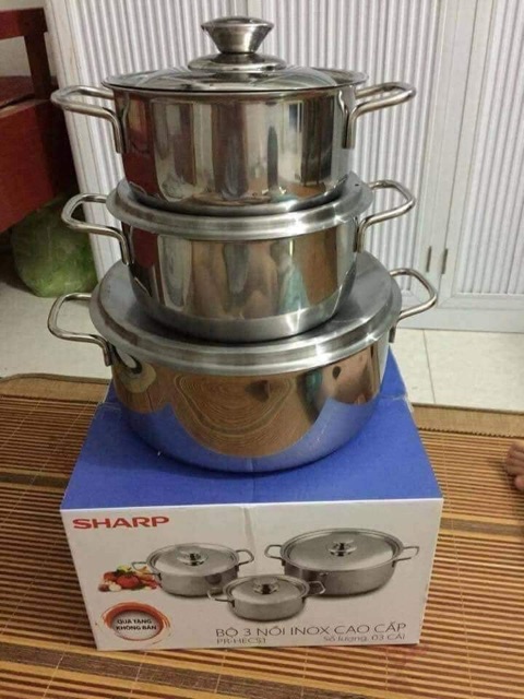 - Bộ 3 nồi Inox Sharp có khả năng chống oxy hóa cực tốt, chống cháy khét, dễ chùi rửa, bảo vệ sứa khỏe cho người thân và gia đình. Đáy nồi 1 đáy giúp thu nhiệt nhanh, tỏa nhiệt đều, giữ nhiệt lâu, tiết kiệm gas, thời gian nấu