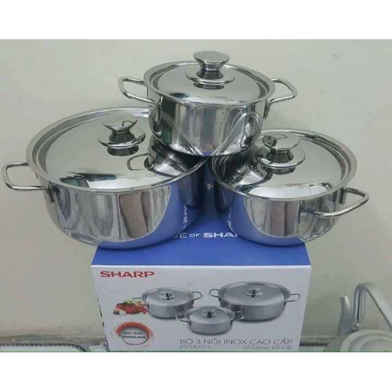 - Sản phẩm có thiết kế nắp inox, đậy kín, giúp giữ hơi nóng tốt và hương vị thực phẩm lâu dài, chống trào thực phẩm khi nấu. Không bị oxy hoá và dễ dàng chùi rửa, giữ được độ sáng bóng trong thời gian dài, đồng thời không ra ten, không làm ảnh hưởng đến chất lượng thực phẩm. Đặc biệt Bộ 3 nồi Inox Sharp Nấu được trên bếp từ.