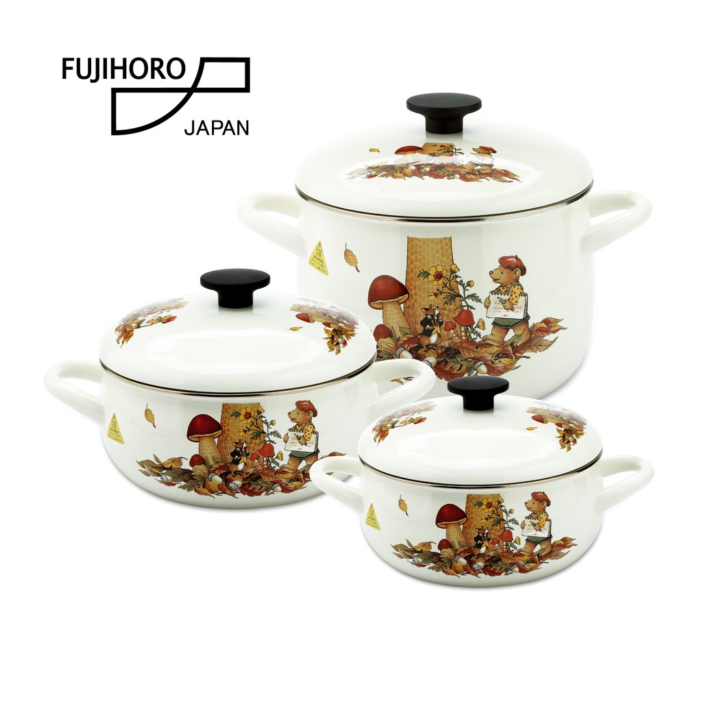 Bộ 3 nồi tráng men cao cấp Nhật Bản Fujihoro FTCV-3 - Họa tiết Con Gấu - Bảo hành 2 năm - Hàng chính hãng