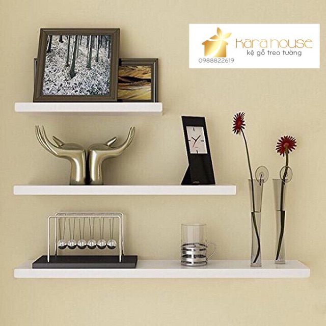 Kệ gỗ treo tường 3 thanh ngang kích thướcDài: 40-50-60cm . Sâu 12cm. Dày 2 cm. Tặng kèm vít và đinh.
