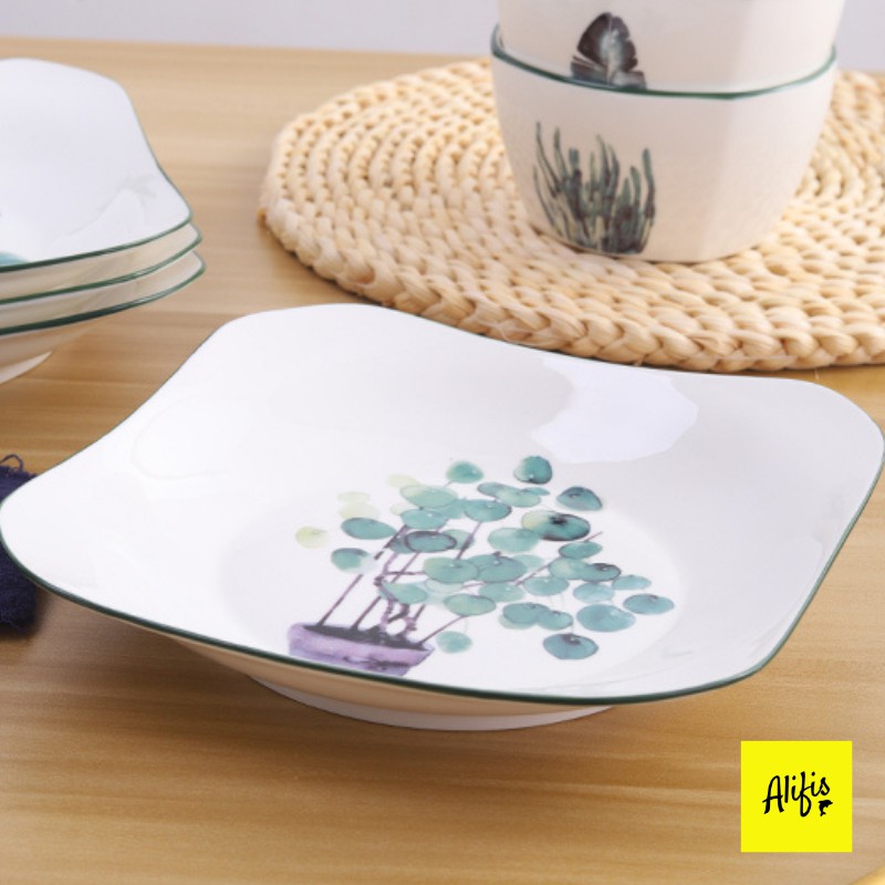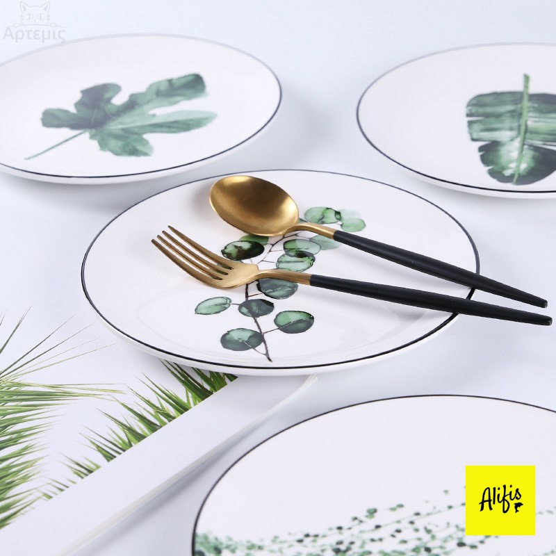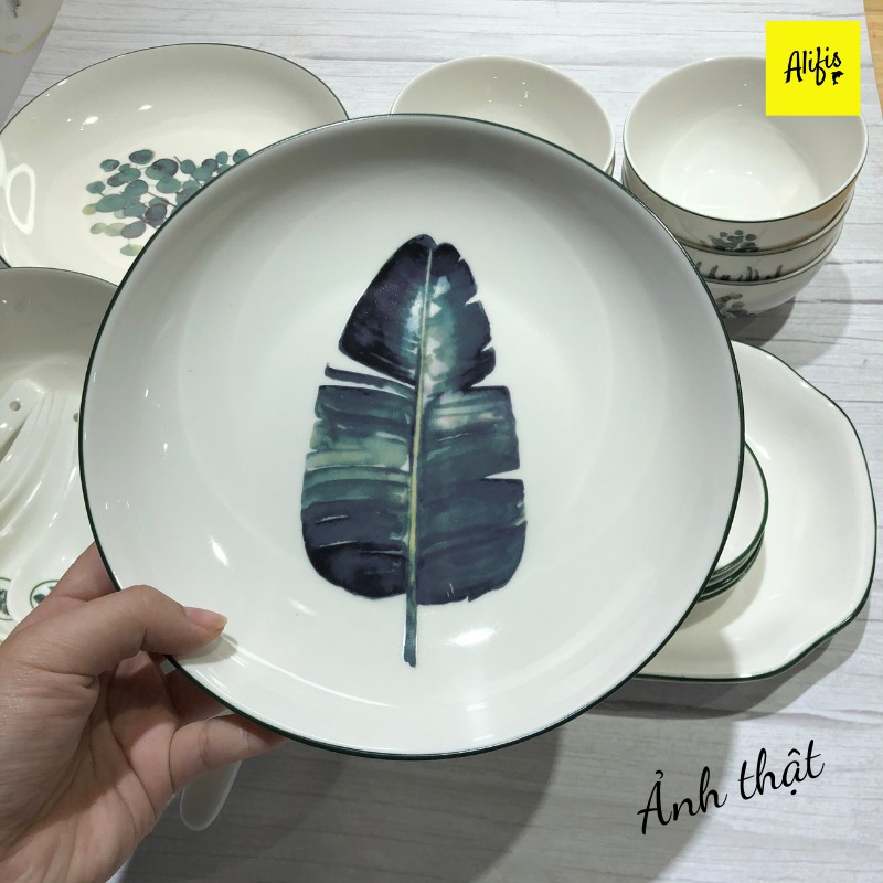 + Bộ đĩa sứ thiết kế sang trọng kết hợp họa tiết cây lá nhiệt đới siêu yêu ạ.