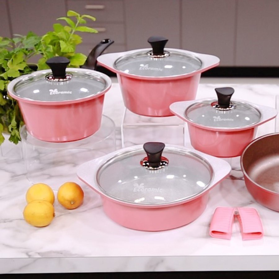 1/ Thiết kế Bộ 4 nồi đá chống dính Ecoramic siêu bền mới với 2 gam màu hồng và xanh dương pastel tinh tế