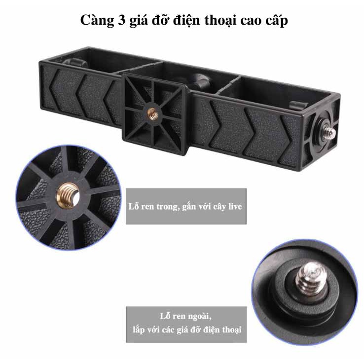 - Bộ ba càng chắc chắn, tặng kèm 2 càng phụ, siêu tiện lợi có thể livestream, quay tiktok nhiều máy điện thoại cùng lúc, đỡ tốn không gian dựng nhiều cây live.