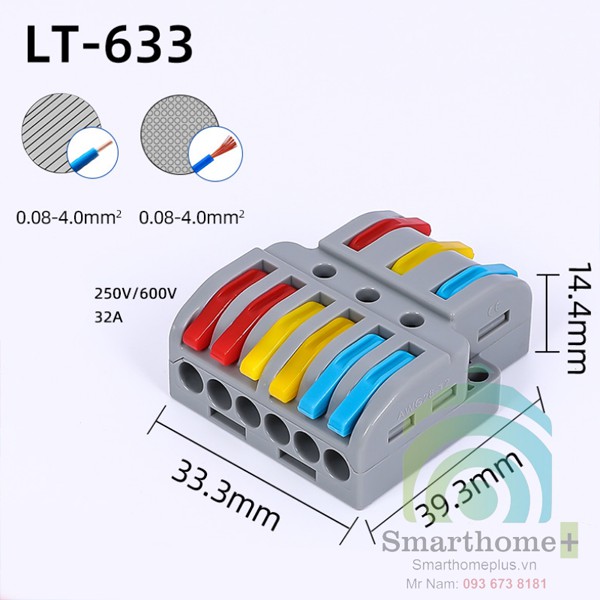 Không cần quan tâm phải nối hay quấn dây điện với nhau đúng cách thế nào. Chỉ việc xỏ các dây điện vào cút nối và gạt cần gạt nhiều màu giữ chặt dây là xong, cút nối điện LT được thiết kế 3 có thể chia 3 dây vào với 6 hoặc 9 dây ra.