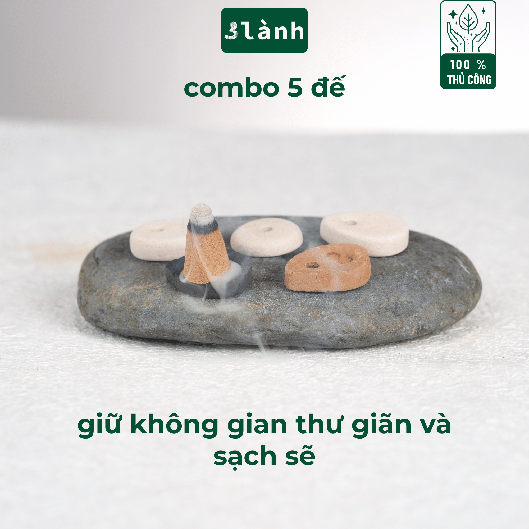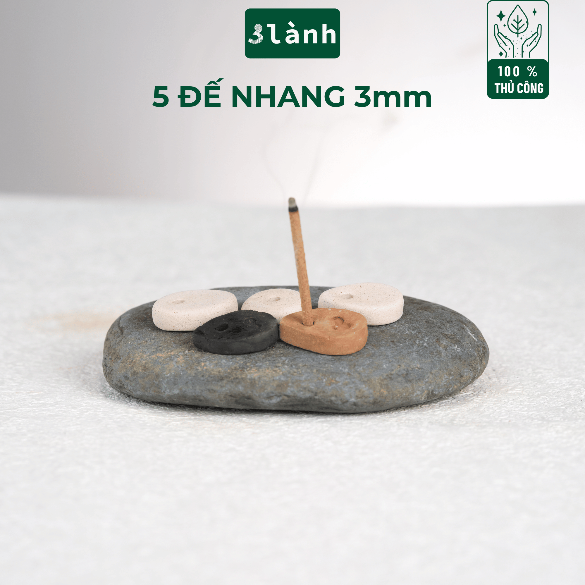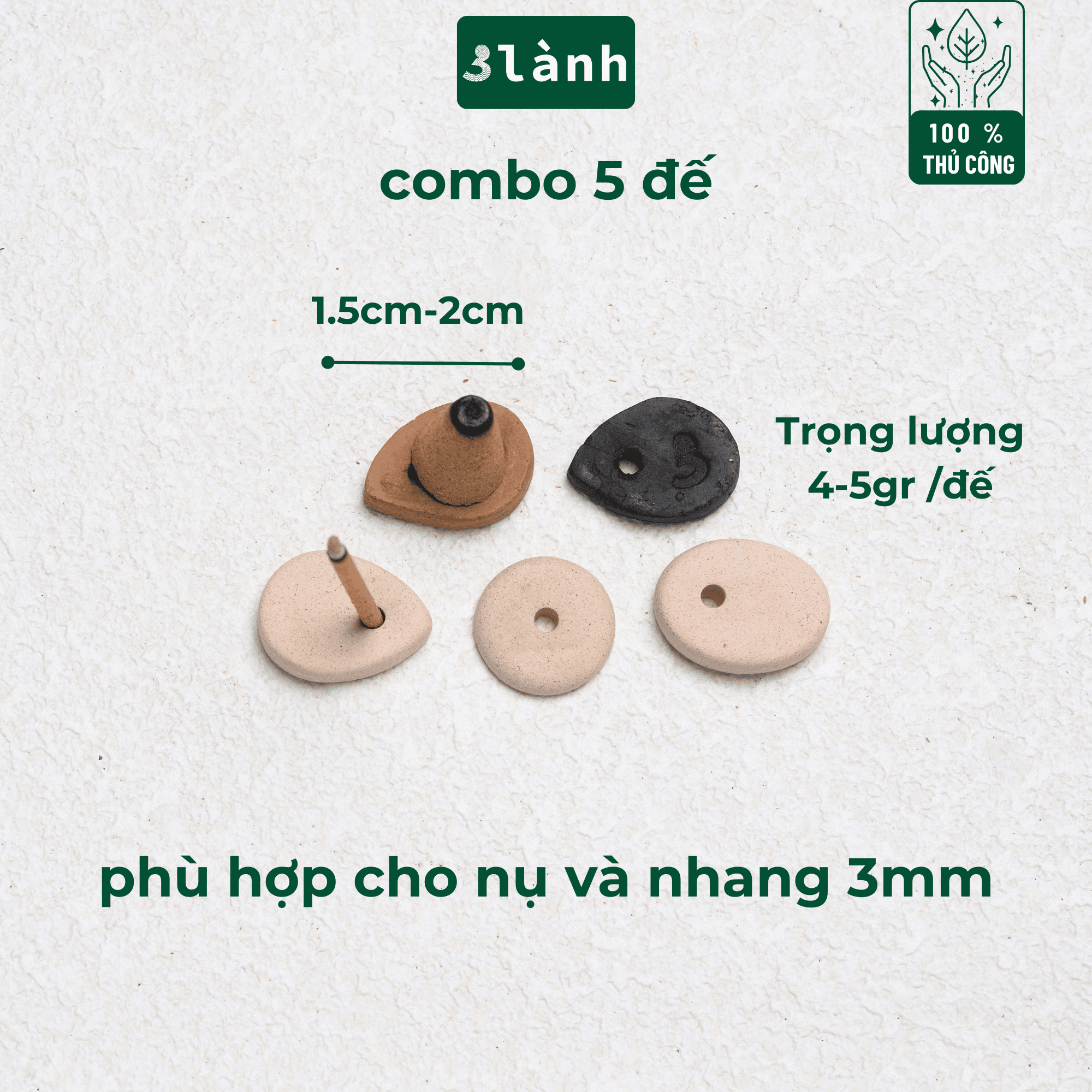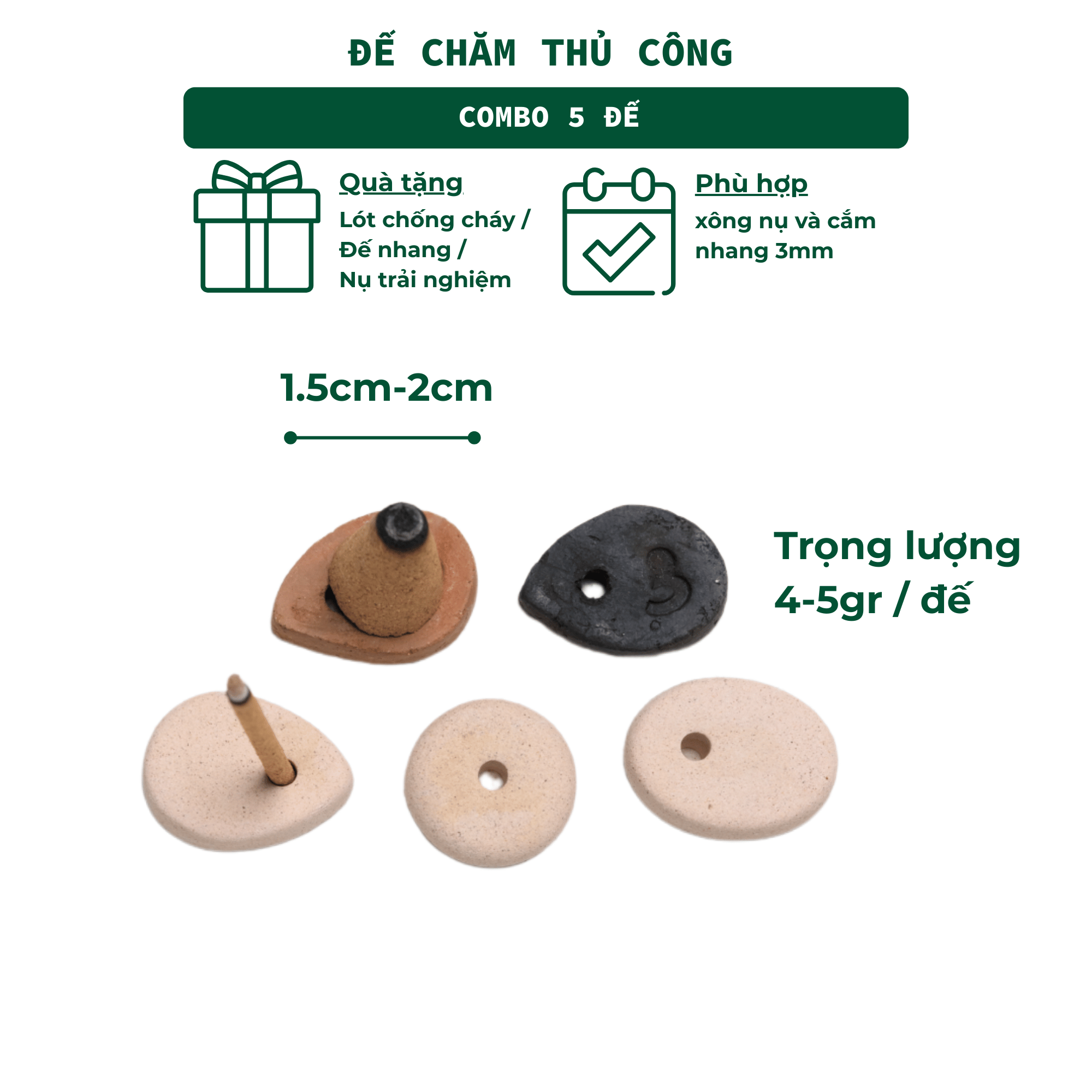 Bộ sẽ bao gồm 5 đế cắm nhang hình dáng khác nhau (do làm thủ công mỗi sản phẩm sẽ không hoàn giống nhau)