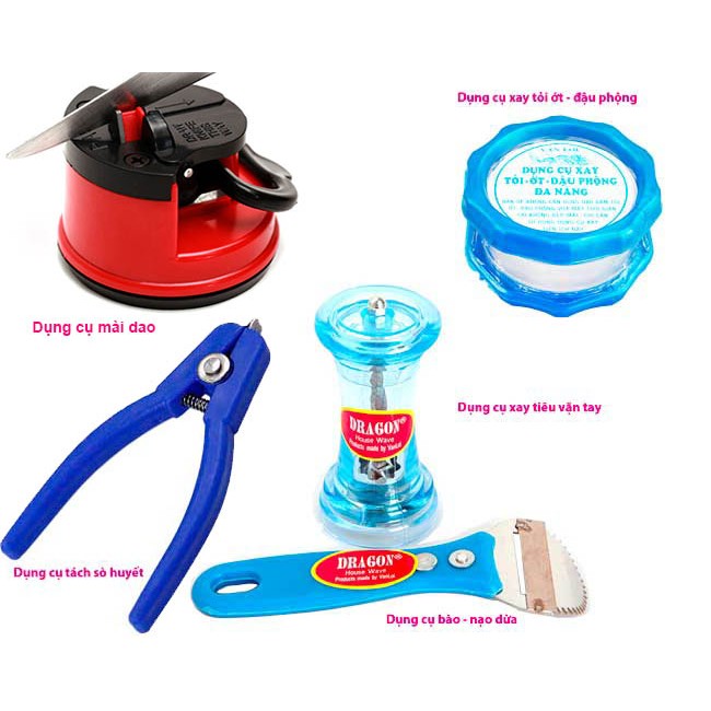Bộ 5 dụng cụ nhà bếp gồm: Dụng cụ mài dao +tách sò huyết + Dụng cụ xay tỏi ớt + Dụng cụ xay tiêu + Dụng cụ nạo dừa 2 trong 1 đa năng- Dụng cụ mài dao với lưỡi mài được làm bằng thép siêu bền không làm sứt mẻ lưỡi dao, kéo khi sử dụng. Sản phẩm phù hợp với mọi kích cỡ dao, kéo lớn nhỏ.