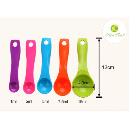 Bộ 5 thìa đo lường có: 5 mức dung tích khác nhau (từ 1ml đến 15ml)