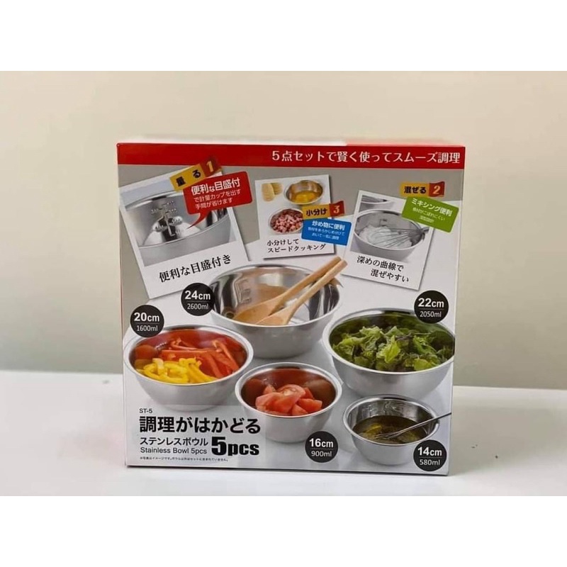 Hàng bên em là nhập chính hãng từ Nhật, có kiểm định chất lượng đàng hoàng. Trong bếp mà có bộ 5 tô inox của Nhật này thì tiện hết nấc chị em ạ, dùng làm bánh, làm tô trộn, làm bát tô, dùng khi nhà có nhiều khách...