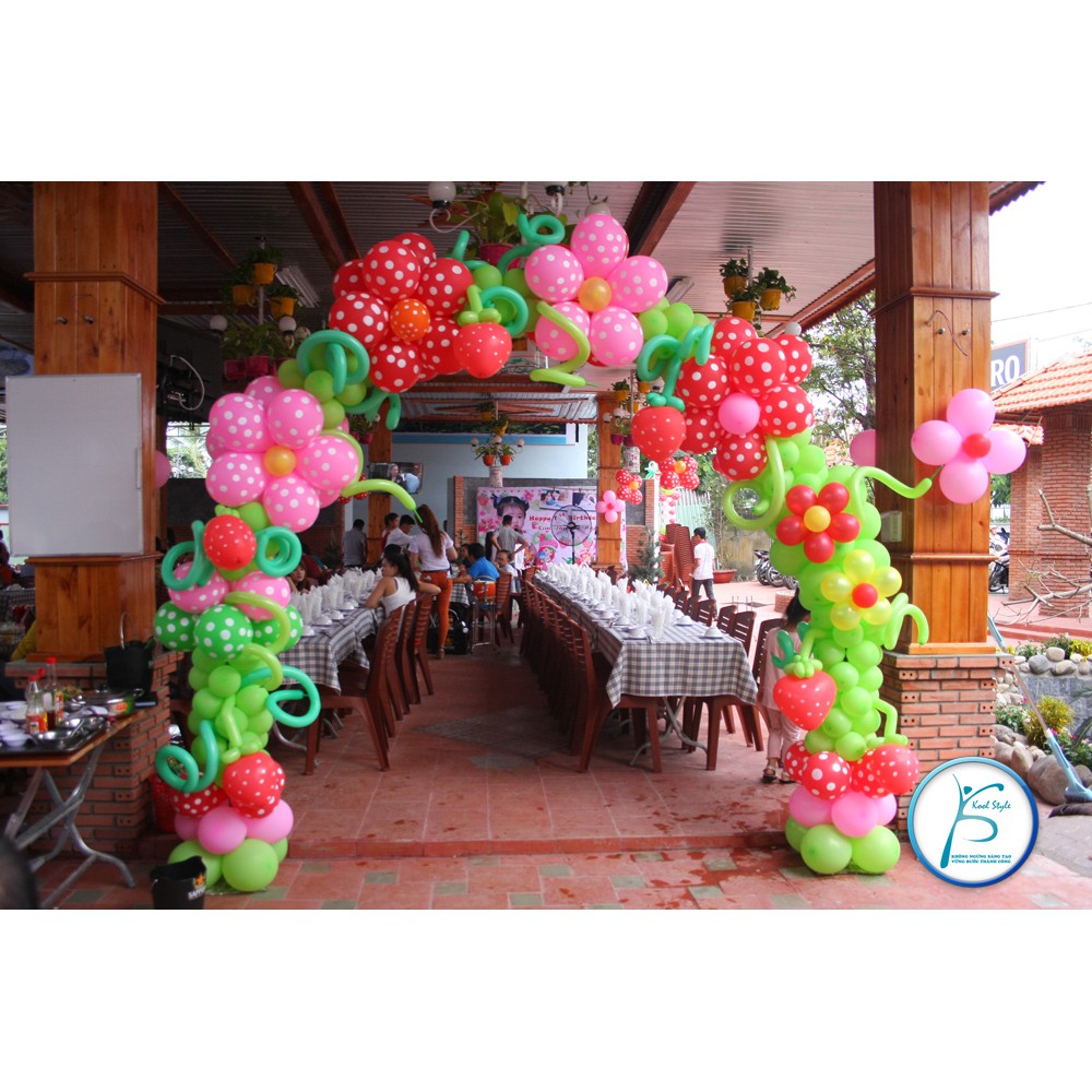 Làm cổng bong bóng: Một chiếc cổng bong bóng được kết lại từ những chiếc bóng chấm bi đủ màu sẽ là điểm nhấn của buổi tiệc sinh nhật, với chiếc cổng này cả người tổ chức sinh nhật và những người khách được mời tới cũng cảm thấy sự tươi mới và sinh động từ những chấm bi.