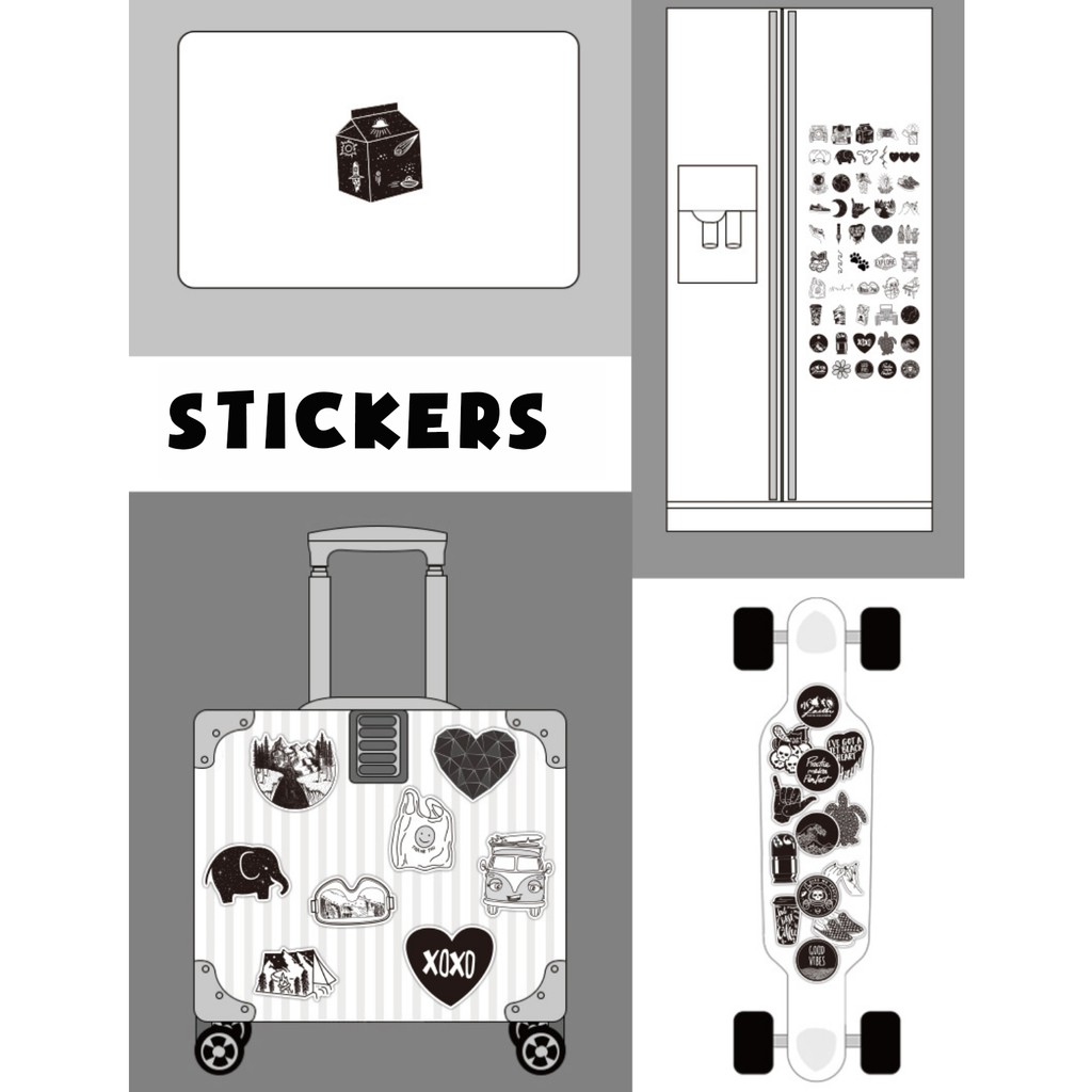Sticker còn gọi là decal, tem, hình dán dùng để trang trí lên tất cả bề mặt cứng: mũ bảo hiểm, laptop, xe máy, ô tô, vali, tường, cửa nhà, tủ quần áo.