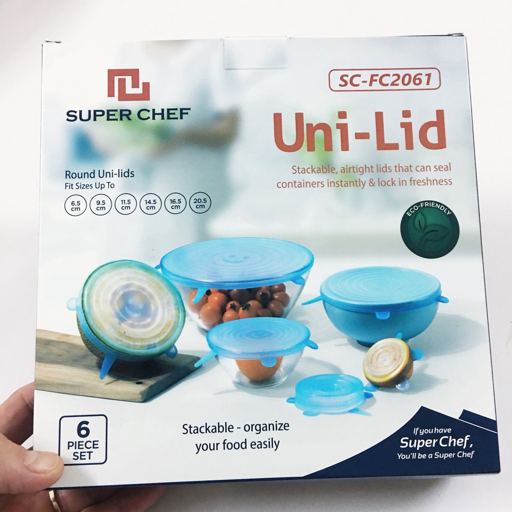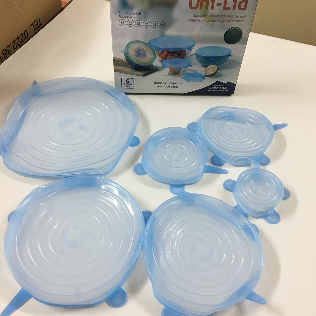 Bộ 6 nắp Silicone đậy thực phẩm đường kính 6.5cm, 9.5cm, 11.5cm, 14.5cm, 16.5cm, 20.5cm dùng đậy kín trong Chén, tô, đĩaCông dụng: Dùng đậy kín bảo quản thực phẩm trong chén, bát, tô, đĩa... kể cả thực phẩm tươi sống kín đến mức nước không tràn ra được