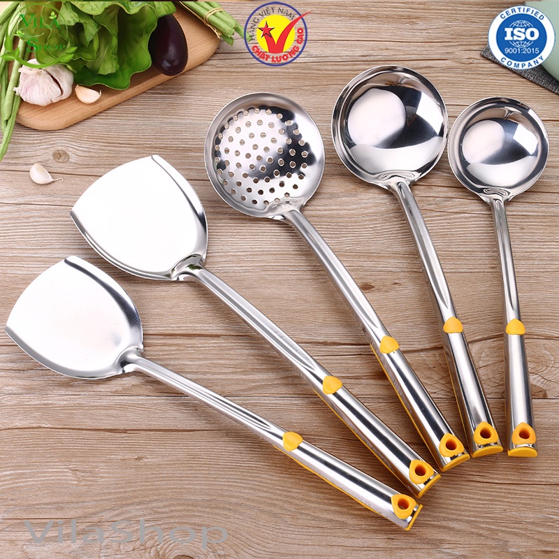 [ 6 Phân Loại ] Muôi Inox, Bộ Muỗng Inox Cán Vàng Đa Chức Năng ( Muôi Thủng - Muôi Canh - Xẻng Sào - Xẻng Thủng )