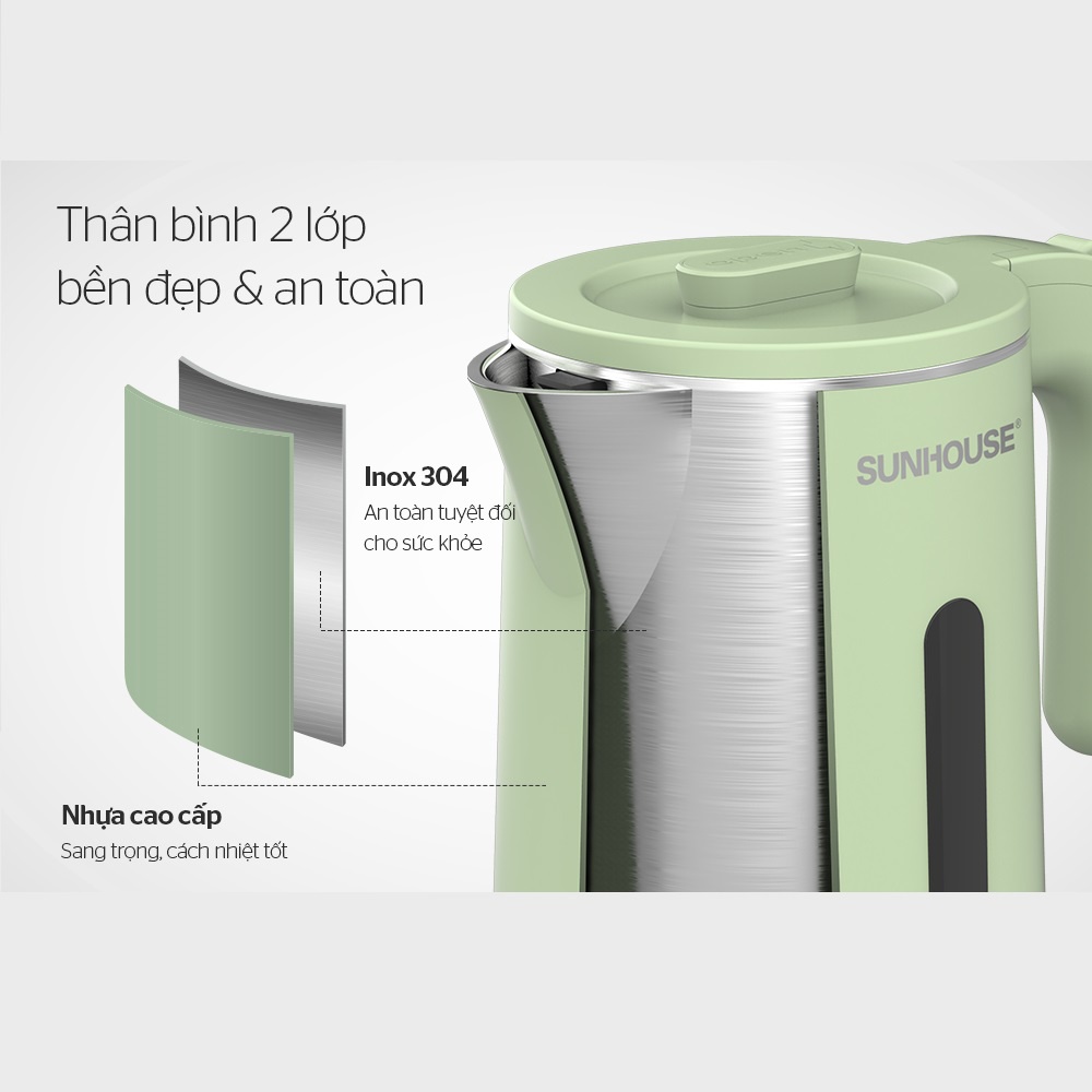 Thiết Bị Điện Gia Dụng > Đồ gia dụng nhà bếp > Ấm đun siêu tốc || Ấm Đun nước Siêu Tốc Đế Đúc Sunhouse SHD1353 1.8l 1500w Chính Hãng, Bình Siêu Tốc Inox 2 Lớp Cao CấpCòn hàng