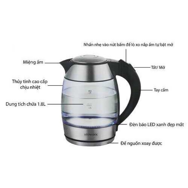 Giới thiệu Ấm điện đun nước siêu tốc thủy tinh Lock&Lock EJK418SLV 1.8L(chính hãng)