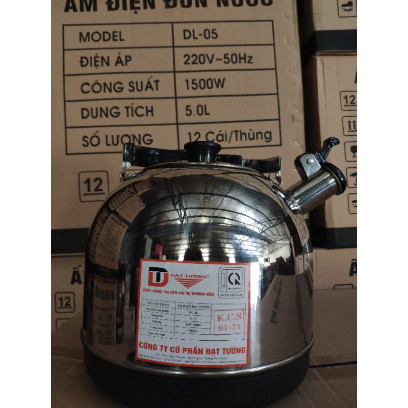 - Ấm điện đế liền cao cấp Đạt Trường ĐL-05 có dung tích 5L giúp người dùng có thể sử dụng nước thoải mái mà không phải đun nhiều lần. Ấm có quai và núm làm bằng nhựa chống cháy rất an toàn khi sử dụng. Ngoài ra, thân ấm cũn được làm bằng inox ngoại nhập, an toàn tron mọi nguồn nước.