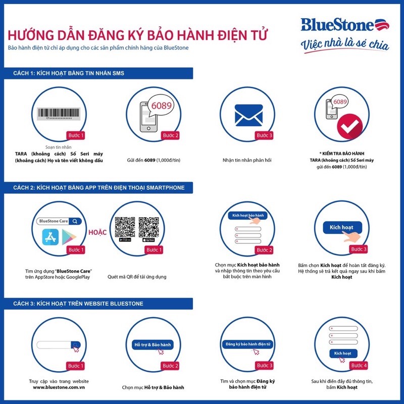 Tiếp nhận bảo hành sản phẩm: tại các Trạm bảo hành ủy quyền BlueStone trên toàn quốc, danh sách niêm yết trên Website