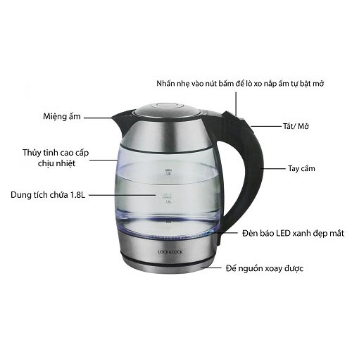 - Ấm điện đun nước thủy tinh Lock&Lock EJK418SLV 1.8L 1850W (Màu bạc) có thể dùng để pha những bình trà, những tách cafe nóng hổi hay nấu mì cực nhanh cho cả nhà mà không cần tốn công sức đun nấu nhiều lần.