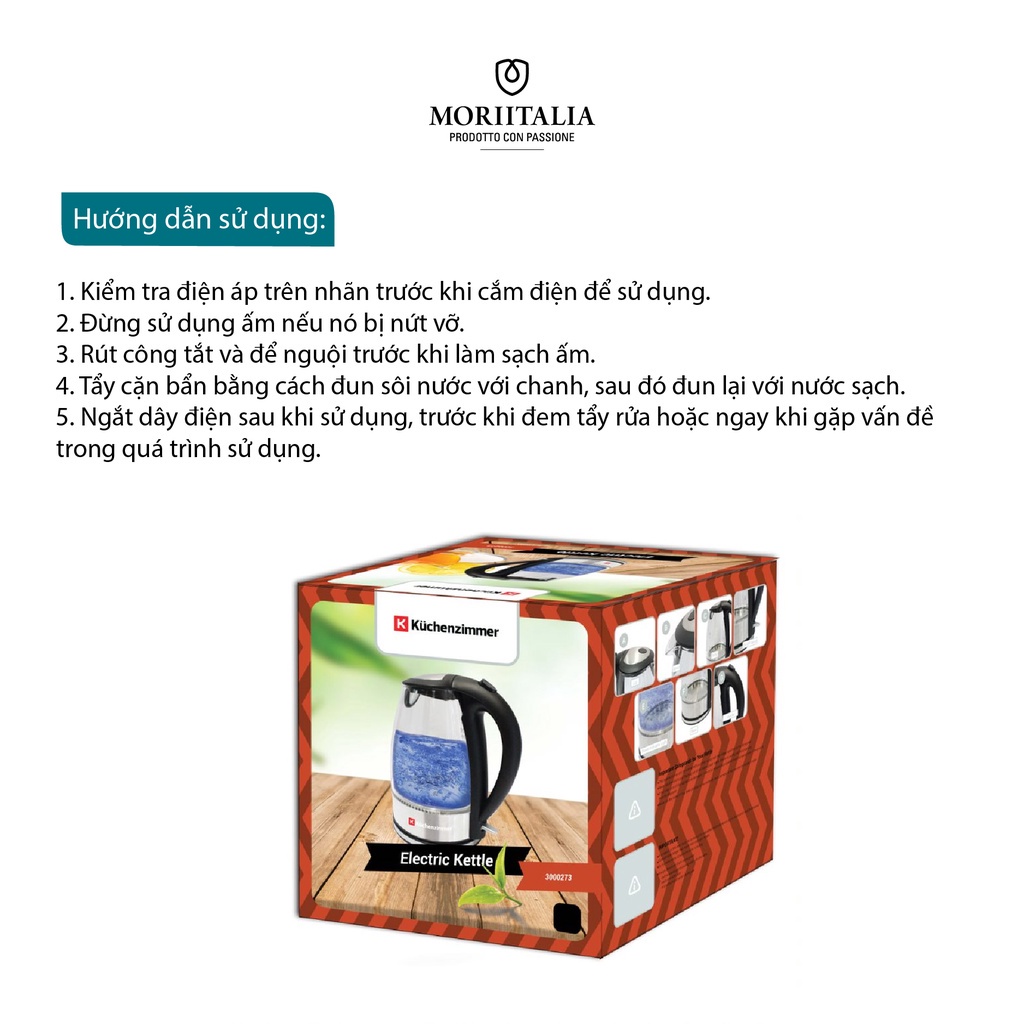 Ấm đun nước thủy tinh Kuchezimmer 1.7 lít cao cấp tiện lợi Moriitalia 3000273Kuchenzimmer là chuyên gia lĩnh vực về đồ điện gia dụng, phục vụ căn bếp của nhà bạn thêm phần hiện đại và tiện ích. Hoàn hảo về thiết kế và tiện lợi khi vệ sinh sản phẩm