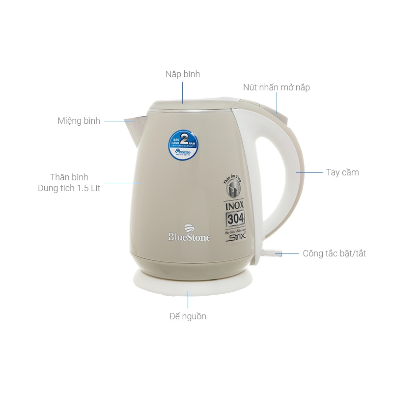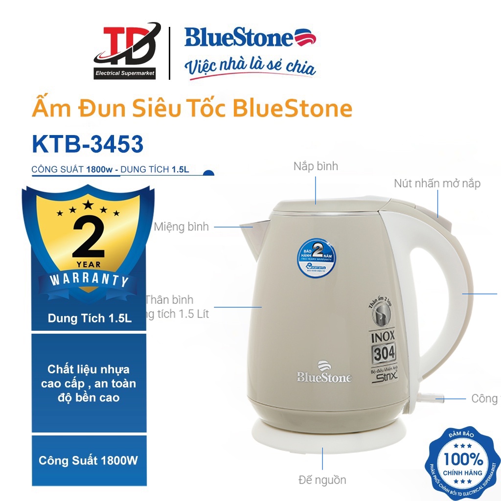 Giới thiệu [Mã ELHAMS5 giảm 6% đơn 300K] Ấm Đun Siêu Tốc Bluestone 1.5 lít KTB-3453, Inox 304 An Toàn , Bảo hành chính hãng 2 năm