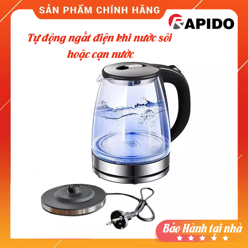 Ấm đun siêu tốc thủy tinh dung tích 1,8 Lit -Bình đun thủy tinh thương hiệu Rapido - Công suất 1800W - BẢO HÀNH UY TÍN