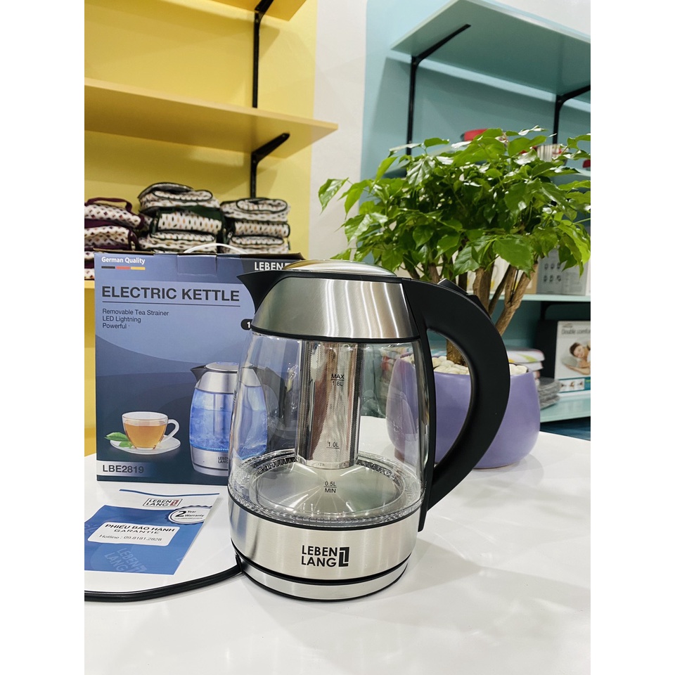 Ấm đun siêu tốc thủy tinh lebenlang 1.8L kèm lõi lọc inox - LBE2819, công suất 1800w, bảo hành 24 tháng