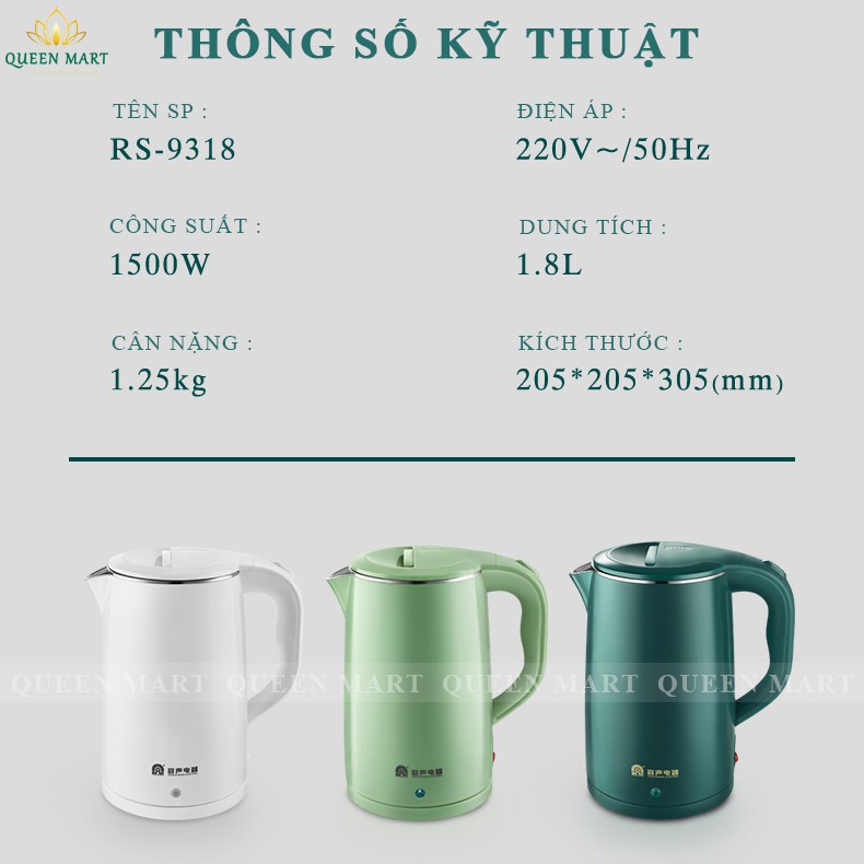 Ấm Siêu Tốc 2 Lớp 1.8 Lít Chống Nóng Chống Giật - Ấm Đun Nước Tự Ngắt Khi Đun Sôi Có Chế Giữ Nhiệt – Q055*** THÔNG SỐ KỸ THUẬT :
