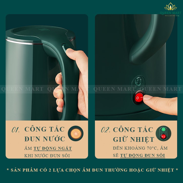 👉 GIỮ NHIỆT : Nước được đun sôi để nguội đến khoảng 70°C sẽ tự động đun tiếp ( nếu bật công tắc giữ nhiệt, nếu không sẽ như ấm siêu tốc thường ).