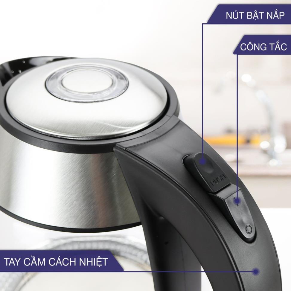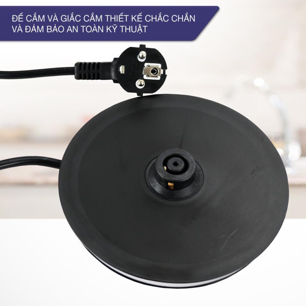 Đặc biệt, sản phẩm có đế xoay 360 độ giúp bạn có thể nấu nước ở nhiều góc độ khác nhau và đế có thể cuốn bảo vệ dây điện tránh được các tác động ngoại lực đồng thời tạo sự gọn gàng cho thiết bị khi không sử dụng. Sử dụng công tắc cảm ứng hơi nước, sẽ tự động ngắt nguồn điện khi nước sôi, đảm bảo an toàn sử dụng.