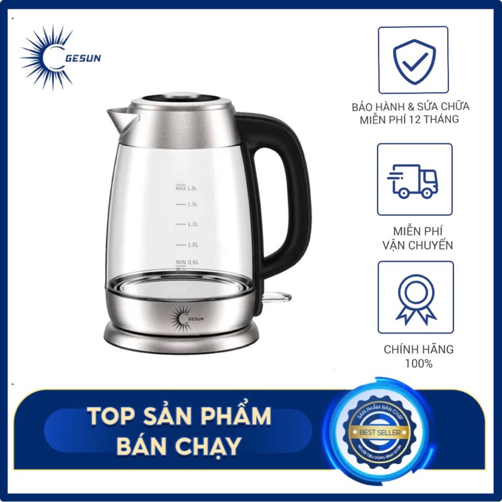 Ấm Siêu Tốc Bình siêu tốc GESUN KTG-758 1,8L,Thiết kế công nghệ đức Chất liệu thủy tinh cao cấp, Bảo hành 24 tháng