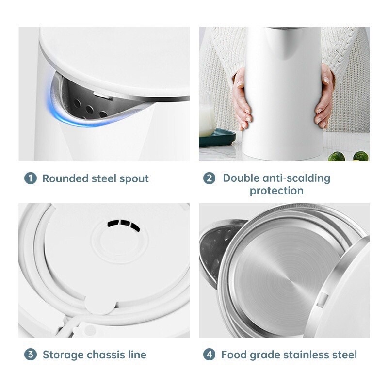 - Thân ấm được cấu tạo 2 lớp, bên trong được làm bằng inox 304 cao cấp an toàn không gây ra các chất độc hại ảnh hưởng đến sức khỏe người dùng, bên ngoài được làm bằng nhựa PP chống nóng an toàn