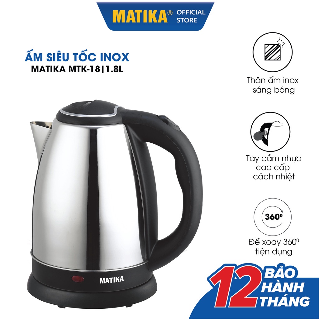 Thông tin Ấm Siêu Tốc MATIKA Inox 1.8L MTK-18:- Thiết kế nhỏ gọn với thân ấm bầu, dung tích 1.8L đáp ứng tốt nhu cầu nước sôi của gia đình bạn.