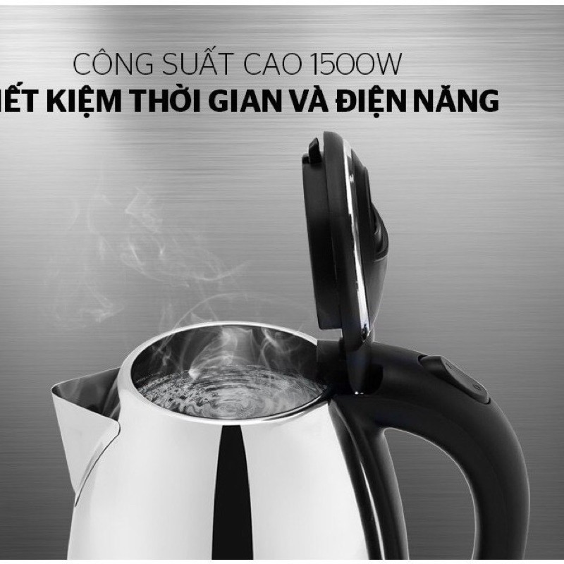 Đặc điểm khác: Thân ấm xoay bằng thép không gỉ sáng bóng, tự động ngắt khi nước sôi. Rơ le bảo vệ khi cạn nước