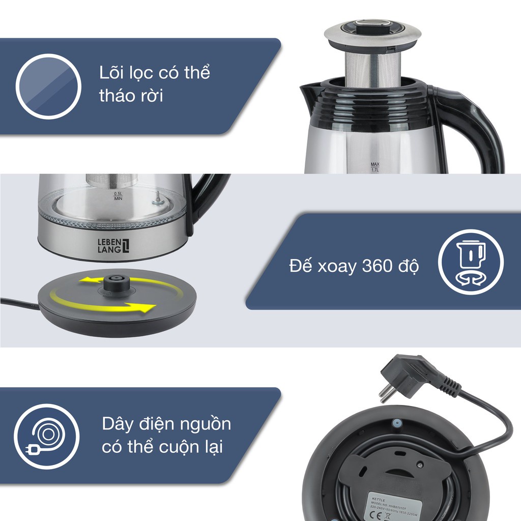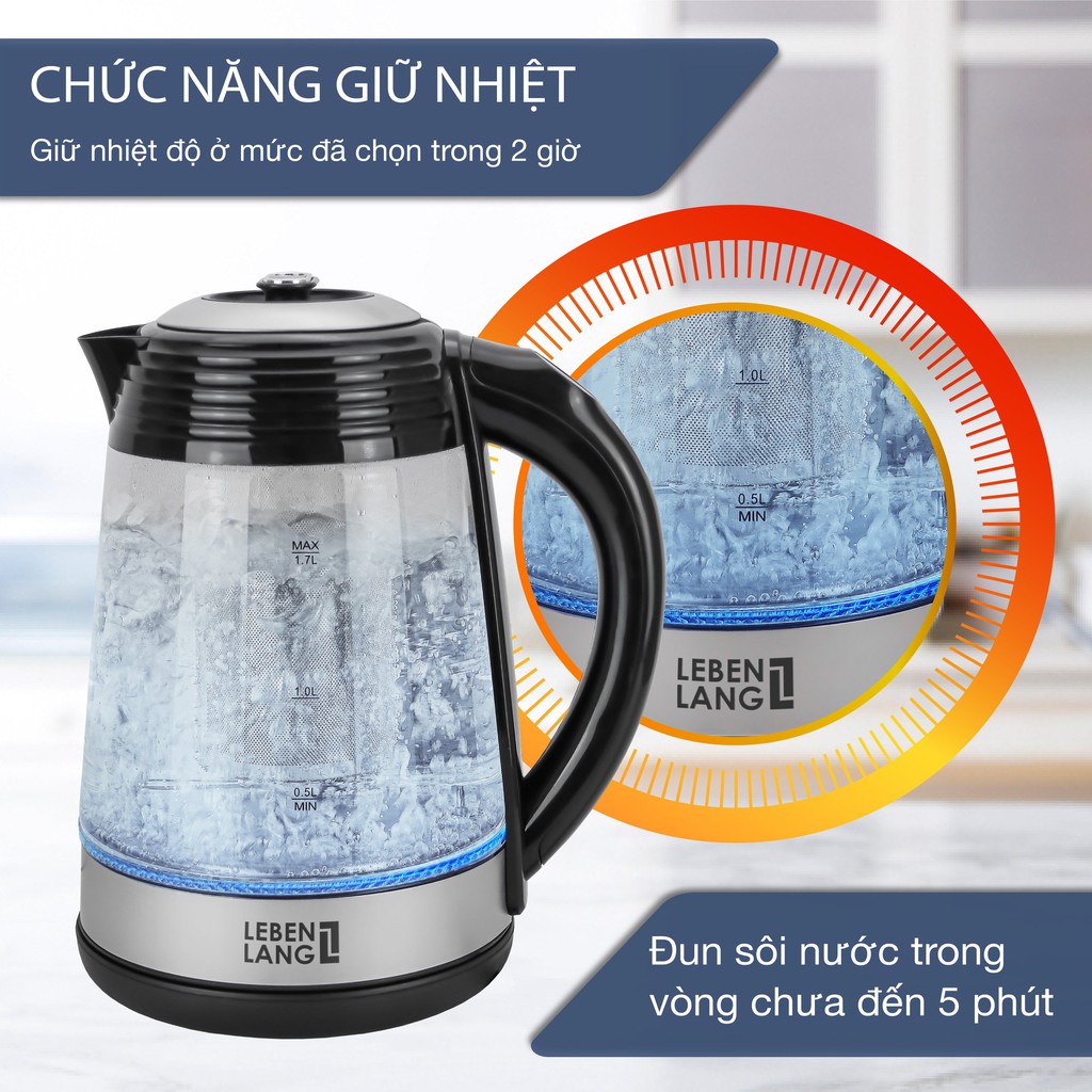 Ấm siêu tốc thủy tinh 1.7L LEBENLANG kèm lõi lọc, điều khiển nhiệt độ, BH 2 năm - LB2676