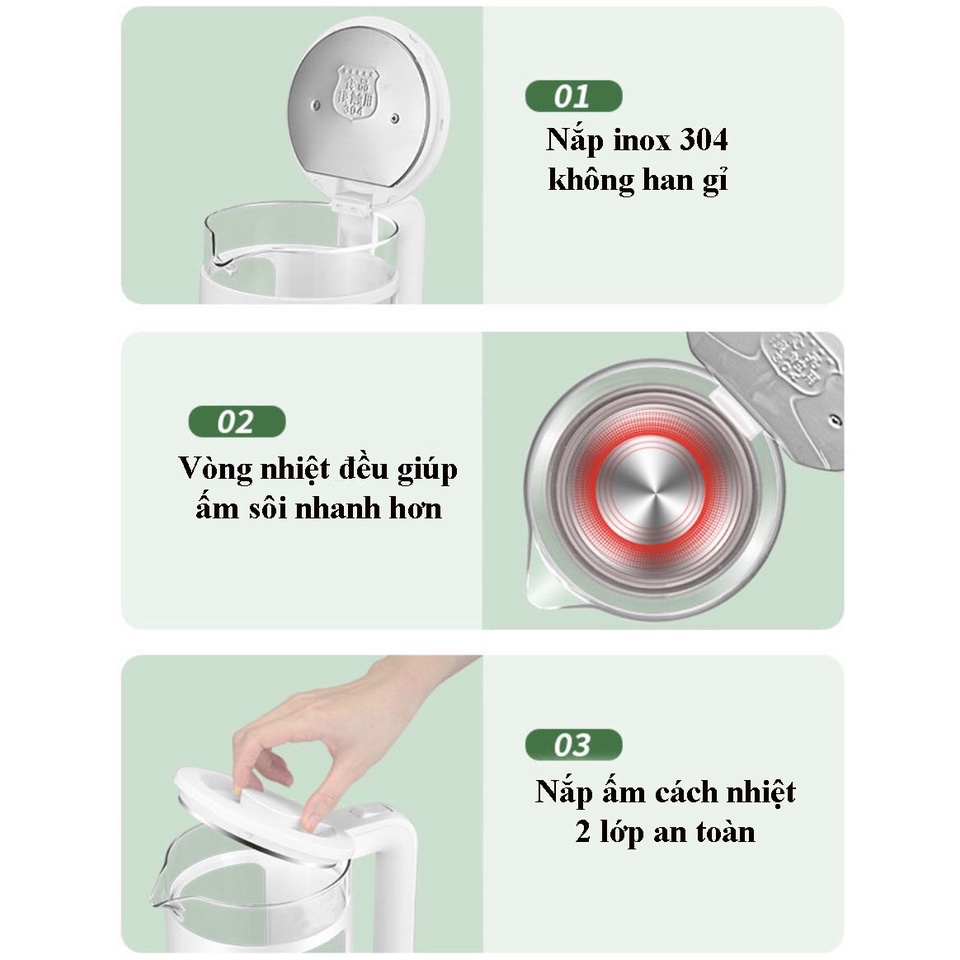 Ấm Siêu Tốc Thủy Tinh Cách Nhiệt Không Đóng Cặn Công Suất Lớn 1360W Dung Tích 1,8 Lít - BH 12 Tháng