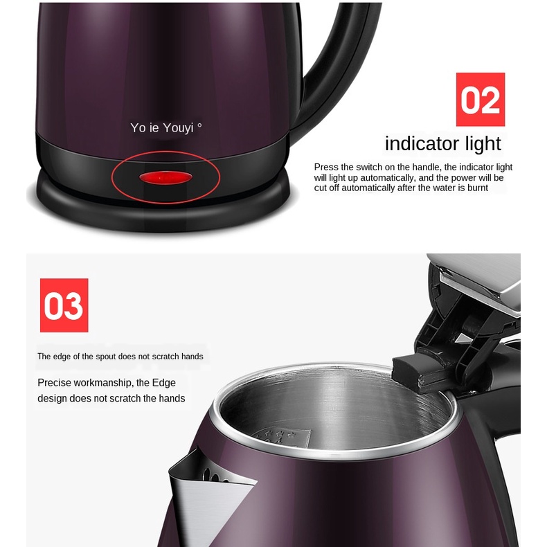 6, Tay cầm cách nhiệt an toàn: Ấm điện Yoice với thiết kế tay cầm bằng chất liệu nhựa cao cấp và có khả năng cách nhiệt, đảm bảo an toàn khi bạn cầm ấm điện rót nước.