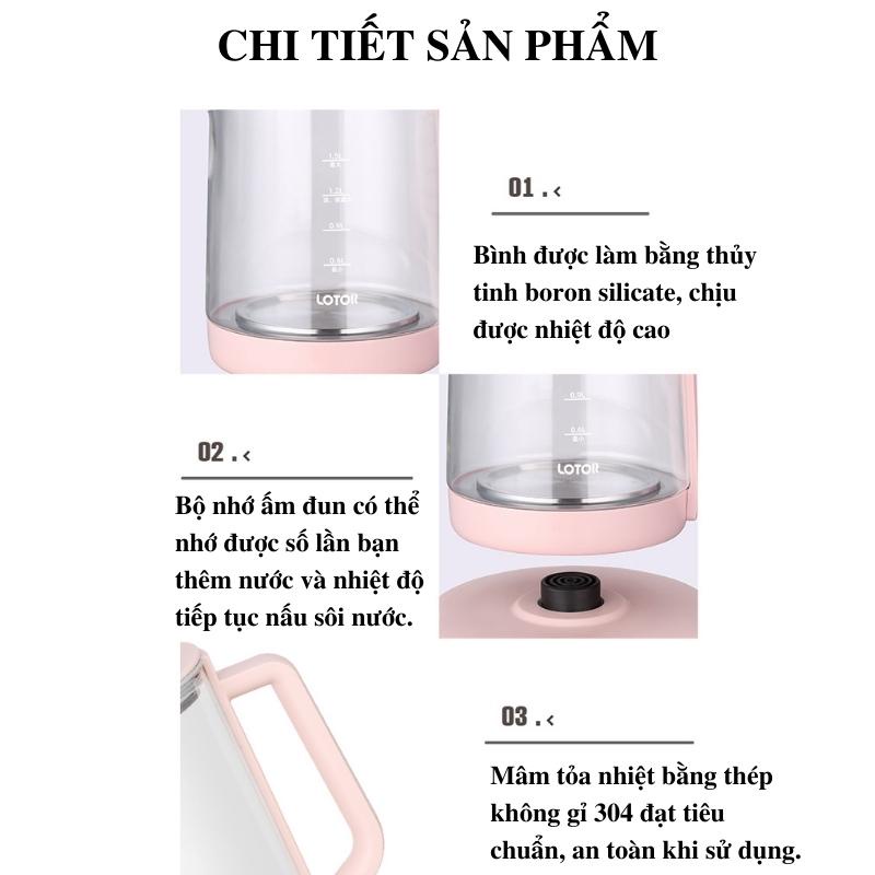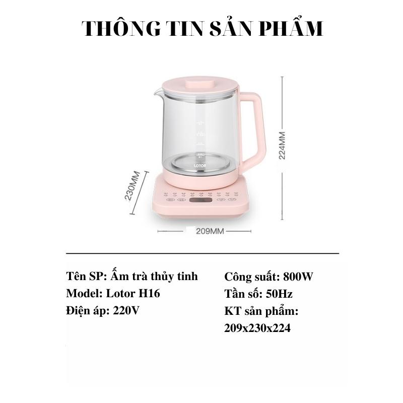 Ấm trà thủy tinh, bình đun nước siêu tốc, đa năng, an toàn sức khỏe, đun nước pha trà nấu cháo chính hãng Lotor H16 – BH 12 tháng.Mô tả sản phẩm: