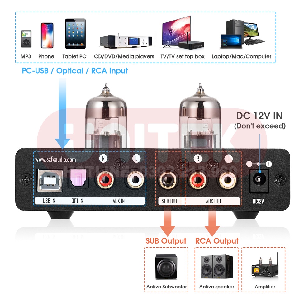 Tính năngThực tế âm thanh đầu vào và đầu ra: Hỗ trợ PC-USB/Quang học/Stereo RCA đầu vào với nút lựa chọn, tương thích với hầu hết các nguồn âm thanh. Với âm thanh Stereo RCA và tần số thấp đầu ra, dễ dàng kết nối hoạt động loa và xây dựng hệ thống kênh 2.1, những hiệu ứng âm bass được tăng cường rất nhiều giống như trong điện ảnh.