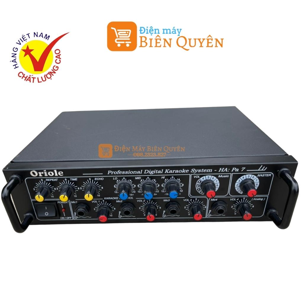 Thiết Bị Âm Thanh > Amply và đầu chỉnh âm || Ampli mini Karaoke công suất lớn 250W Oriole PA7 chính hãng, 4 sò lớn, 4 đường mic, nguồn 220V-12V, (tặng dây av 40K)Còn hàng