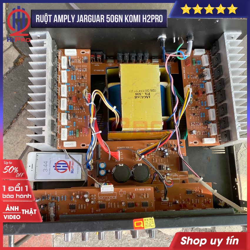 Amply Jarguar 506N KOMI H2Pro 16 sò lớn Toshiba-1080W-4 đường tiếng-Chống hú-linh kiện Hàn Quốc, Amply karaoke Jarguar 506N công suất lớn chạy khoẻ 2 cặp bass 30 (tặng 10m dây loa 160K)Amply Jarguar 506N KOMI là dòng amply cao cấp, được Komi nhập linh kiện của Jarguar từ Hàn Quốc về Việt Nam lắp ráp nên giá thành rẻ hơn mà chất lượng không kém hơn bản nguyên chiếc từ Hàn Quốc. Amply karaoke Jarguar 506N công suất lớn 1080W chạy khoẻ 2 cặp bass 30, sáng tiếng, lực khoẻ, đặc biệt chống hú rất tốt. H2pro tự hào là đại lý phân phối Amply Jarguar 506N KOMI 16 sò, cam kết chất lượng, kèm hậu mãi bảo hành 1 năm từ hãng.